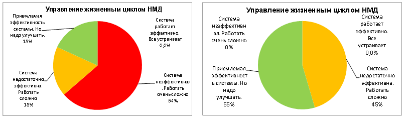 Рис. 4. Оценка руководителями существующей системы управления ЖЦ НМД, 2012 год (слева), 2013 год (справа).
