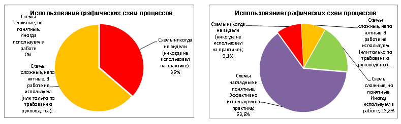 Рис.2. Мнения руководителей о существующих графических схемах процессов, 2012 год (слева), 2013 год (справа).