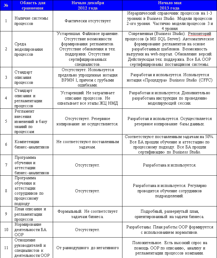 Рассмотрим пример внедрения указанных выше технологий в ООР конкретной торгово-производственной компании численностью несколько тысяч человек. В таб. 2 показаны некоторые изменения, которые произошли в компании в период с начала декабря 2012 года по начало мая 2013 года.