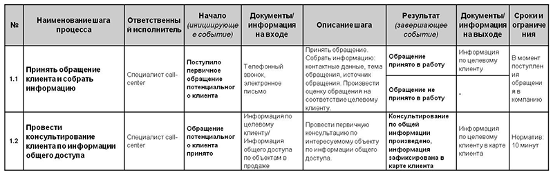 Инструмент №2, – простое текстовое табличное описание процесса. Не всем бизнес-пользователям и “обычным” сотрудникам понятна графическая нотация, текст в таблице чаше всего понятен всем. В табличном описании процесса появляются важные детали, нормативные сроки по шагам процесса. Пример табличного описания на рис.2. Но в данном случае не наглядны параллельные работы, сложно увидеть все сверху, на одной странице (для большей наглядности используется 1 инструмент).