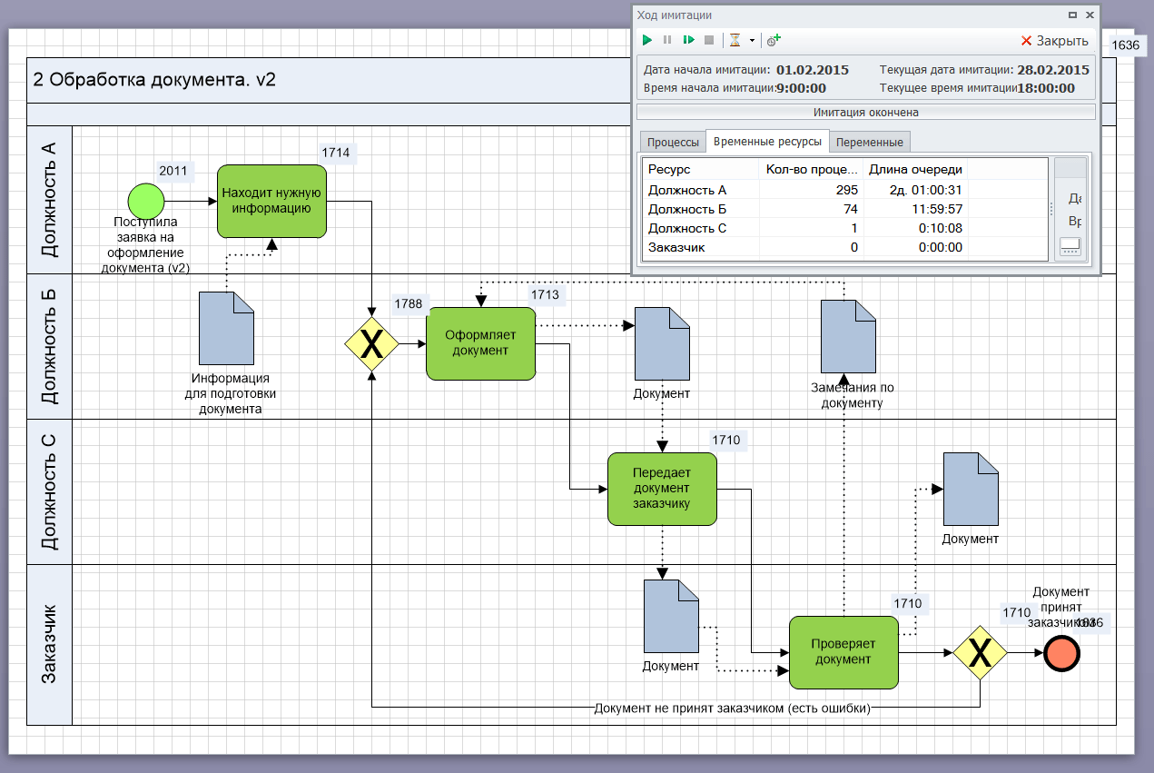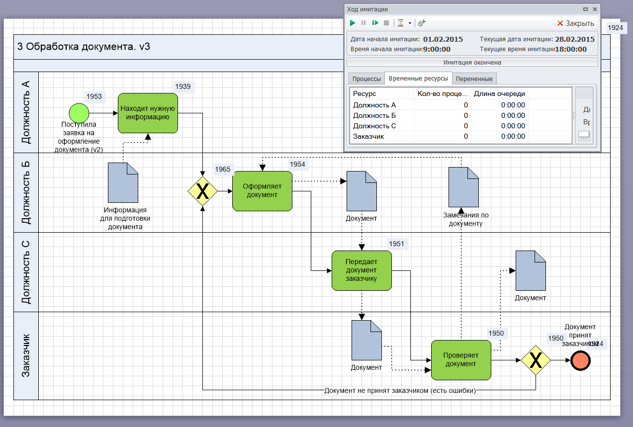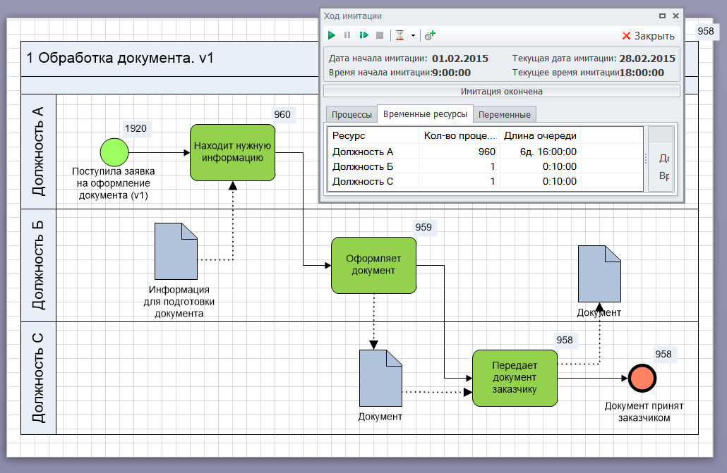 Посмотрим теперь, что будет в реальной ситуации. Для этого опишем рассматриваемый бизнес-процесс и проведем его имитационное моделирование в среде Business Studio 4.0. Для начала, пусть на каждой должности находится по одному сотруднику.