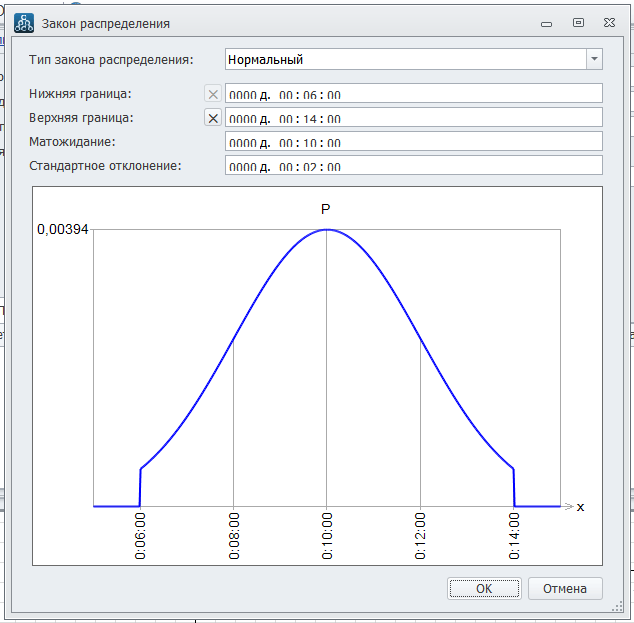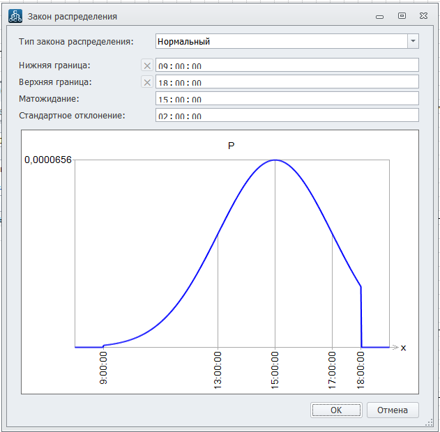 На рис. 5. показано распределение времени выполнения операций процессов. Видно, что матожидание времени выполнения составляет 10 минут. Вопрос. Кто-то может рассчитать «на пальцах» по простой формуле, сколько сотрудников потребуется для результативного выполнения такого процесса? Вряд ли… Кто-то скажет, что можно сделать расчет «по среднему», но он не будет учитывать пиковые нагрузки, которые для реального бизнеса и представляют наибольший интерес... И это только один простейший процесс. А сколько в организации сложных процессов? Обосновывая численность персонала по формуле, мы можем допустить ошибку, которая приведет либо: А) потерям из-за избыточного количество сотрудников; Б) снижению результативности бизнес-процессов, недовольству клиентов и т.п. Как видим, ни одна из указанных альтернатив нас не устраивает. Посмотрим, что покажет имитация процесса. На рис. 6. показан пример имитационного моделирования с учетом указанных обстоятельств.
