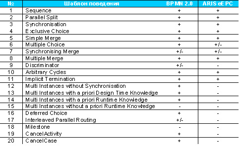 Теперь перейдем непосредственно к сравнению нотаций. С точки зрения описательной способности, т.е. реализации шаблонов (паттернов) поведения, можно использовать результат работы голландского ученого в области компьютерных наук профессора Вила ван дер Аалста. Им были предложены 20 стандартных шаблонов поведения, используемых при моделировании процессов. Наличие или возможность реализации этих структур посредством одной из нотаций и будет являться критерием их описательной способности. Анализ возможности реализации этих паттернов был проведен в работах Яна Мендлинга (2005 г.) и Петии охеда (2006 г.). Знак “+” означает возможность моделирования данной структуры, знак “-” означает, что такую структуры невозможно смоделировать, знак “+/-” значит, что структуру можно реализовать, но используя несколько элементов нотации.