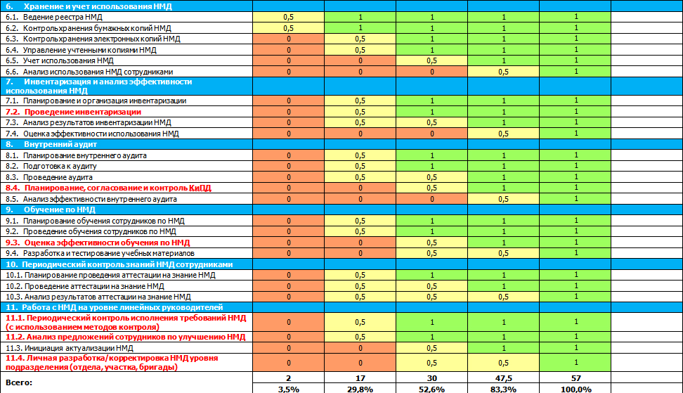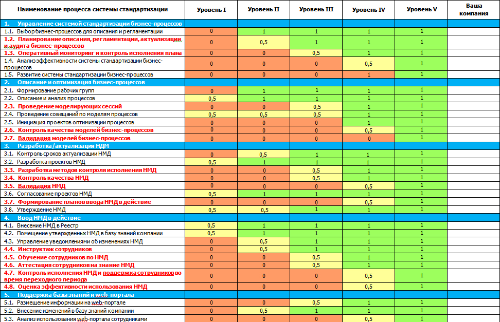 В таблице 1 представлена характеристика каждого уровня развития ССБП. Цветом показано состояние процессов системы. Оранжевый цвет – процесса нет, цифра «0». Желтый цвет – процесс есть, но работает недостаточно эффективно, оценка «0,5». Зеленый цвет – процесс есть, эффективная работа, оценка «1». Красным цветом выделены процессы, на которые стоит обратить особое внимание. Именно они позволяют замкнуть контуры управления и делают систему управляемой.