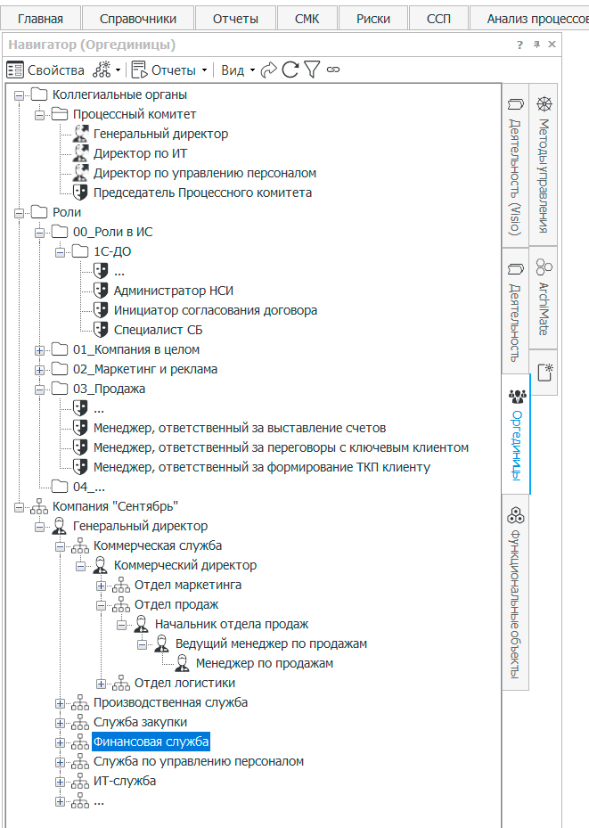 При переходе на уровень операционных исполняемых бизнес-процессов (модели в нотации BPMN) в Business Studio нужно создавать дорожки на основе должностей или ролей (так же можно использовать программное обеспечение). Если каждый процессный аналитик будет создавать эти должности и роли «на ходу» и как попало, то очень скоро справочник будет представлять из себя информационную помойку. Например, один сотрудник создаст должность «Руководитель отдела продаж», другой – «Начальник Отдела продаж», третий – «Руководитель ОП» и т.д. То же самое касается ролевой структуры. Поэтому лучше всего, когда первичное заполнение справочника «Оргединицы» в части организационной структуры компании выполнит Процессный методолог, с учетом требований и правил, сформулированных в «Соглашении по моделированию» организации. Пример структуры такого документа можно посмотреть здесь.
