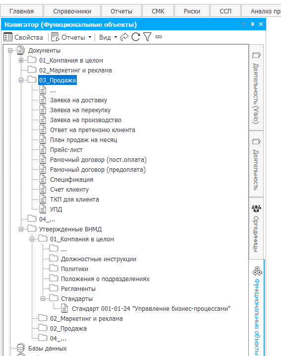 Возможны различные группировки документов по папкам. Если в вашей организации стандартов немного, то можно не усложнять излишне структуру папок по категориям бизнес-процессов, а сделать папки по видам ВНМД или просто использовать одну папку для всех документов. Если же ВНМД много, то для удобства поиска можно создать развитую структуру папок.