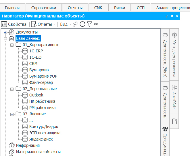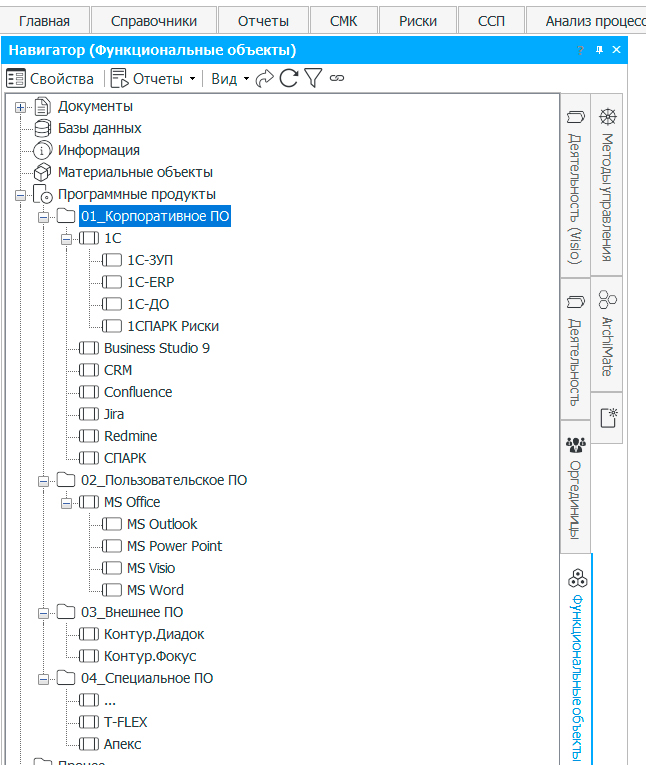 Можно группировать программное обеспечение с использованием папок, например: «Корпоративное ПО», «Пользовательское ПО» и проч. Процессный методолог совместно с ИТ-службой может заполнить этот справочник в начале проекта. В некоторых компаниях подробно расписывают модули и функции ERP-систем для того, чтобы потом на схемах в нотации BPMN можно было увидеть, какие задачи выполняются с использованием конкретных функций ERP.
