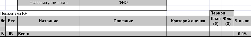 Итоговый отчет с расчетом показателей материального стимулирования. Данная таблица содержит в себе столбцы с номером бонуса, весом бонуса, полным названием показателя, критерием оценки, плановым (нормативным) значением показателя, фактическим значением показателя и процентом выполнения показателя. Например, в колонке "Критерий оценки" введена информация "R>100% Б=0%", это означает, что при фактическом значении показателя больше ста процентов "процент выполнения показателя" будет равен нулю. Итоговая строка содержит сумму произведений веса бонуса на процент выполнения.