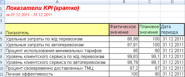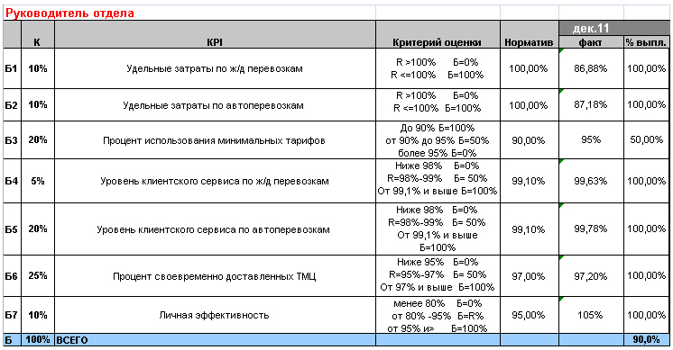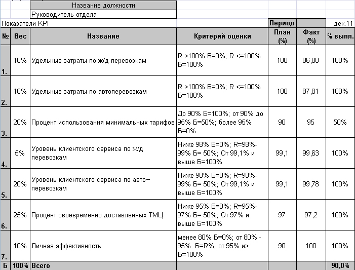 Целью Руководителя транспортного отдела является организация недорогой, своевременной и качественной доставки ТМЦ клиентам, поэтому он отвечает за выполнение следующих показателей: - удельные затраты по ж/д перевозкам – отношение транспортных затрат на 1 ед. продукции по ж/д перевозкам в отчетном периоде к нормативу транспортных затрат на 1 ед. продукции, - удельные затраты по автоперевозкам – отношение транспортных затрат на 1 ед. продукции по автоперевозкам в отчетном периоде к нормативу транспортных затрат на 1 ед. продукции, - процент использования минимальных тарифов – отношение количества перевозок с минимальными тарифами к общему количеству перевозок, - уровень клиентского сервиса по ж/д перевозкам – отношение количества доставленных без претензий и возвратов ТМЦ по ж/д перевозкам в отчетном периоде к общему количеству доставленных по ж/д ТМЦ в отчетном периоде, - уровень клиентского сервиса по автоперевозкам – отношение количества доставленных без претензий и возвратов ТМЦ по автоперевозкам в отчетном периоде к общему количеству доставленных на авто ТМЦ в отчетном периоде, - процент своевременно доставленных ТМЦ – количество своевременно доставленных ТМЦ к общему количеству доставленных ТМЦ, - личная эффективность – отношение числа выполненных в срок и с заданным качеством заданий к общему числу поставленных заданий в отчетном периоде. Отчетная таблица с расчетом для руководителя отдела выглядит следующим образом (см. рис. 1):